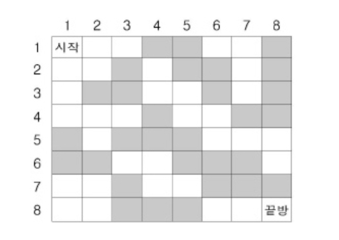 그림과 같은 N x N 미로가 있다. 빈방은 흰색(1), 벽은 검은색(0)이다.