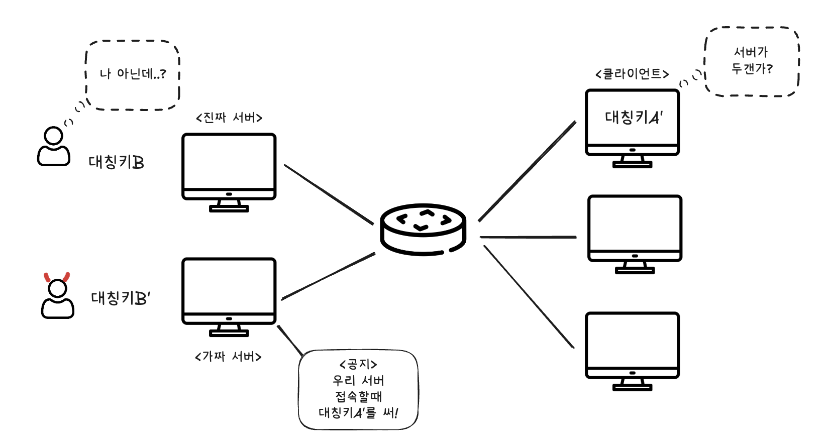 SSL 보안의 필요성'공개키 암호화 방식 이해하기'에서 알아보았듯이, 인터넷을 통해 전달되는 모든 정보는 다른 컴퓨터가 읽을 수 있다. (이제부터 도청이라고 부르겠다) 따라서 아무도 읽지 못하도록 암호화하는 것이 중요했다. 그런데 중요한 정보를 훔치는 데에는 도청 말고도 수많은 방법이 있다. 한가지 방법은 정상 서버에 가짜 유저가 요청을 보내는 것이다. 이것은 서버측에서 사용자 인증을 강화해서 해결할 수 있다.또 다른 방법은 가짜 서버를 만들어서 정상 유저가 입력하는 모든 정보를 갈취하는 것이다. 입력하는 정보가 아무리 암호화되어있다고 해도, 가짜 서버에서 복호화 될 수 있는 형태라면 결국 그 정보는 도난 당하게 된다.따라서 요청을 보낼 곳이 내가 접속하고싶은 서버가 맞는지 확인하는 과정이 아주 중요하다..